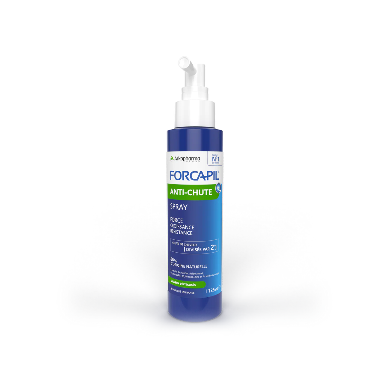 Pour plus de naturalité, Forcapil Spray Anti-chute est 88 % d’origine naturelle, sans tensio-actifs sulfatés, sans silicone et testé sous contrôle dermatologique.