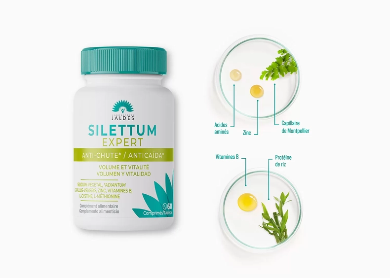 SILETTUM Expert anti-chute est un complément alimentaire spécialement conçu pour freiner la chute de cheveux. Il est formulé à partir d’ingrédients d’origine naturelle tels que la capillaire de Montpellier*, reconnue pour aider à prévenir la chute des cheveux, et le bambou riche en silicium, minéral essentiel pour la santé des cheveux.